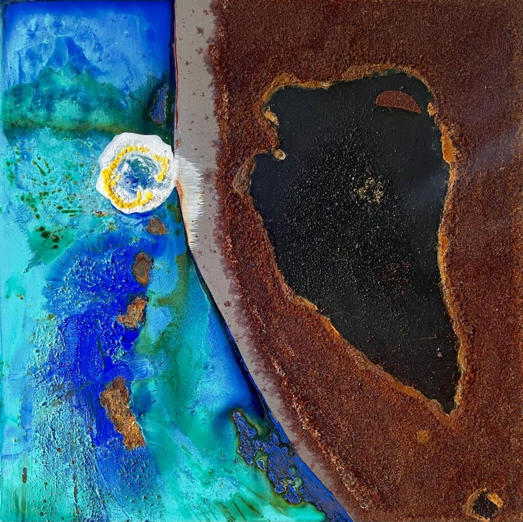 Parallel dazu entwickelt sie abstrakte Arbeiten, die stark vom Eigenleben der verwendeten Materialien geprägt sind. Dinand sammelt unterschiedliche Medien und Werkstoffe und lässt sie teils über lange Zeit „reifen“, bevor sie sie in ihren Prozess integriert. Aus Pigmenten, Holz oder scheinbar „unperfekten“ Fundstücken entsteht ein offener, experimenteller Arbeitsweg, an dessen Ende ein verdichteter, energetischer Ausdruck einer Erfahrung oder eines Gedankens steht.